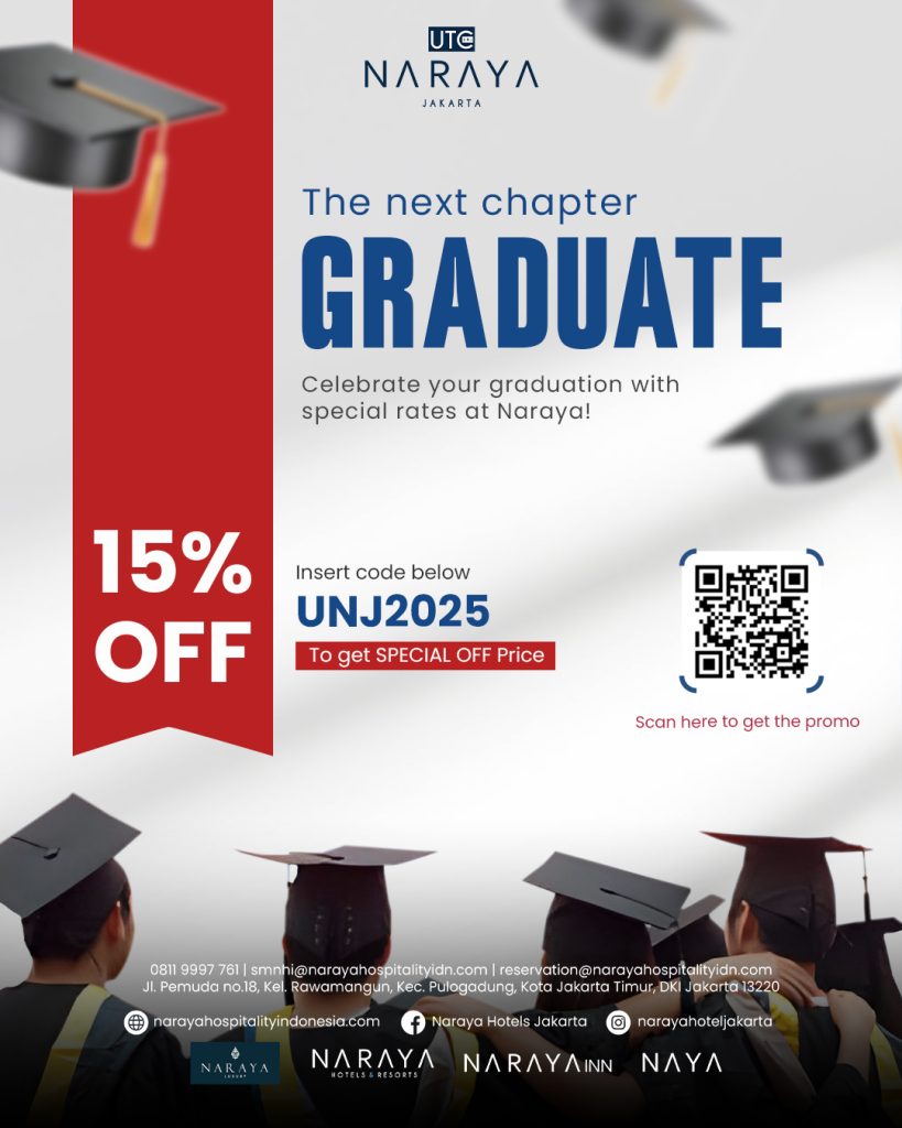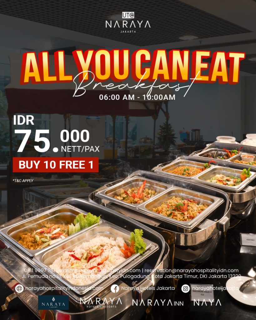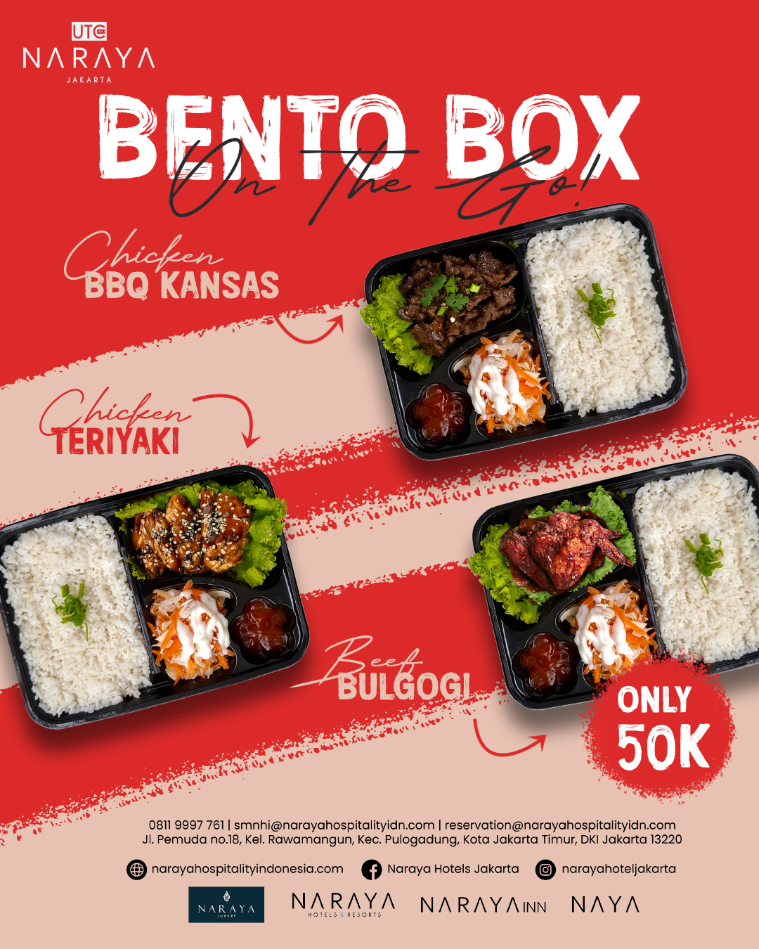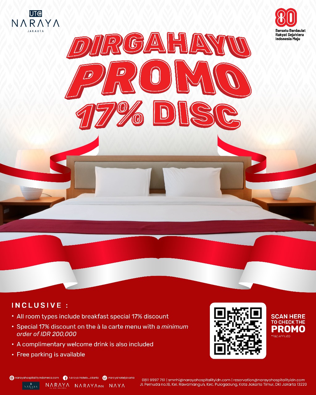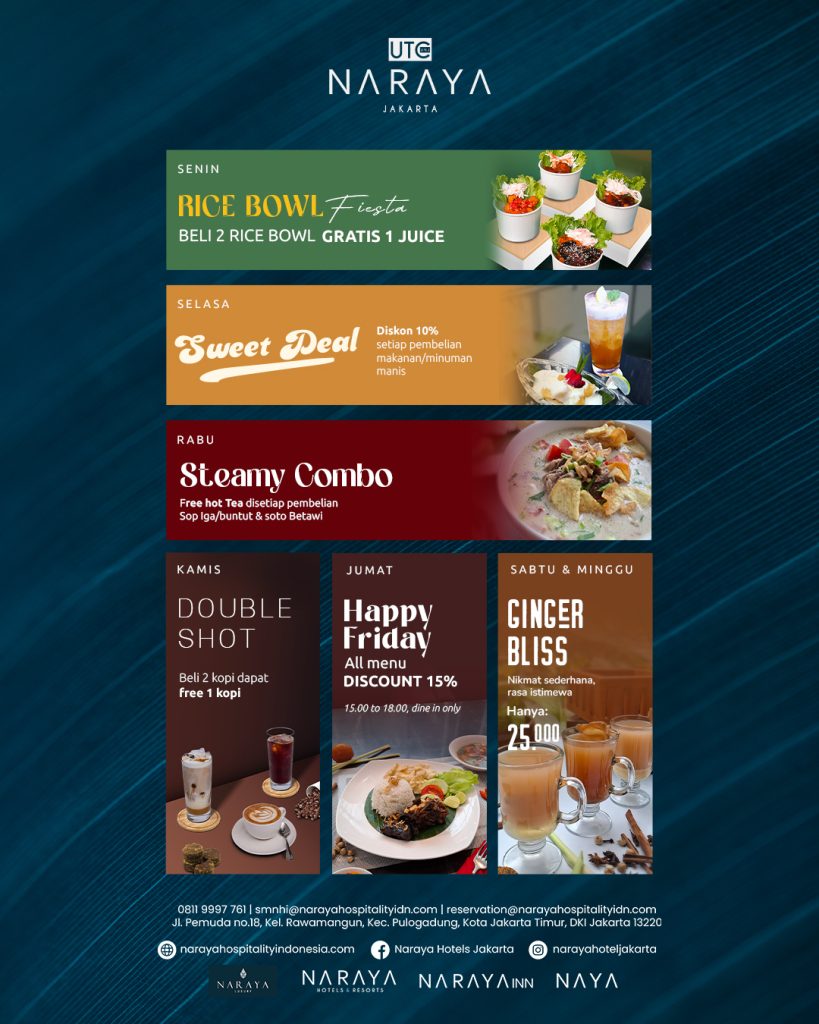 Promo Special Offers Rayakan momen spesial Anda bersama Naraya Hotel dengan promo eksklusif untuk pelanggan setia! Shocktober Promo Graduate Promo Daily Promo Bento Package Breakfast Package Independence Package Paket Arisan Valentine Promo Room Promo Iftar Promo